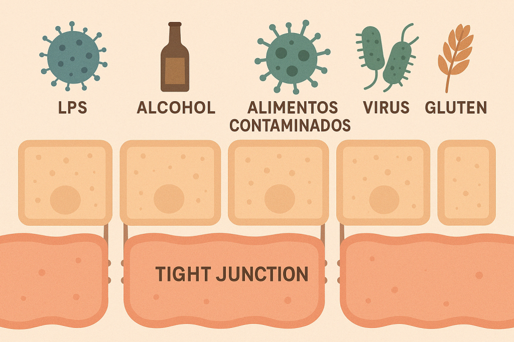 El síndrome de intestino permeable se refiere a un aumento anormal (patológico) del paso de macromoléculas a través de las uniones entre las células epiteliales del intestino, llamadas tight junctions (uniones estrechas). Estas estructuras regulan el paso selectivo de nutrientes y protegen contra el ingreso de toxinas, bacterias o algún agente dañino. Diversos estímulos como el gluten, infecciones o el estrés pueden activar la secreción de zonulina, una proteína que separa temporalmente las uniones estrechas (1). Este aumento de permeabilidad permite la translocación (traslado) de fragmentos o sustancias generadas por bacterias, como el lipopolisacárido (LPS), a la sangre,o generando inflamación (2,3)