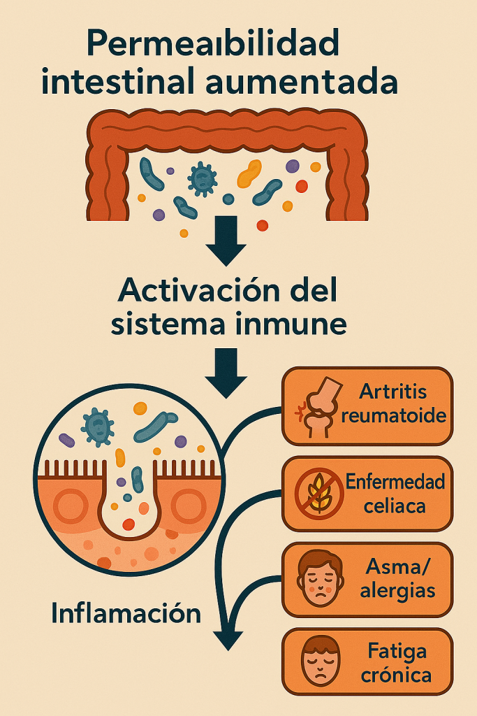 El intestino no es solo un órgano que te ayuda a digerir: es también es, por decirlo en simple, el centro de operaciones principal de tu sistema inmune en tu cuerpo. Cuando su barrera se ve comprometida, entran a la sangre sustancias que no deberían entrar (proteínas no digeridas, bacterias, compuestos generados por bacterias como LPS/lipopolasaaridos) generando señale sde alerta al sistema inmunitario provocando inflamación (que a su vez aumenta la permeabilidad) y pérdida de tolerancia inmunológica. Esto contribuye al desarrollo o exacerbación (agravar) de alergias o enfermedades autoinmunes como diabetes tipo 1, celiaquía, artritis reumatoide y esclerosis múltiple (4,5,47).