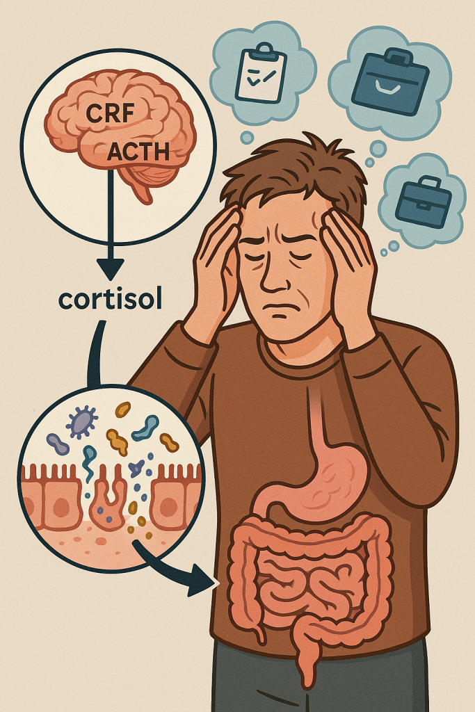 - Estrés crónico: Mediante el eje hipotálamo-hipófisis-adrenal, el estrés aumenta cortisol y CRF, lo que debilita los tight junctions (13,14).